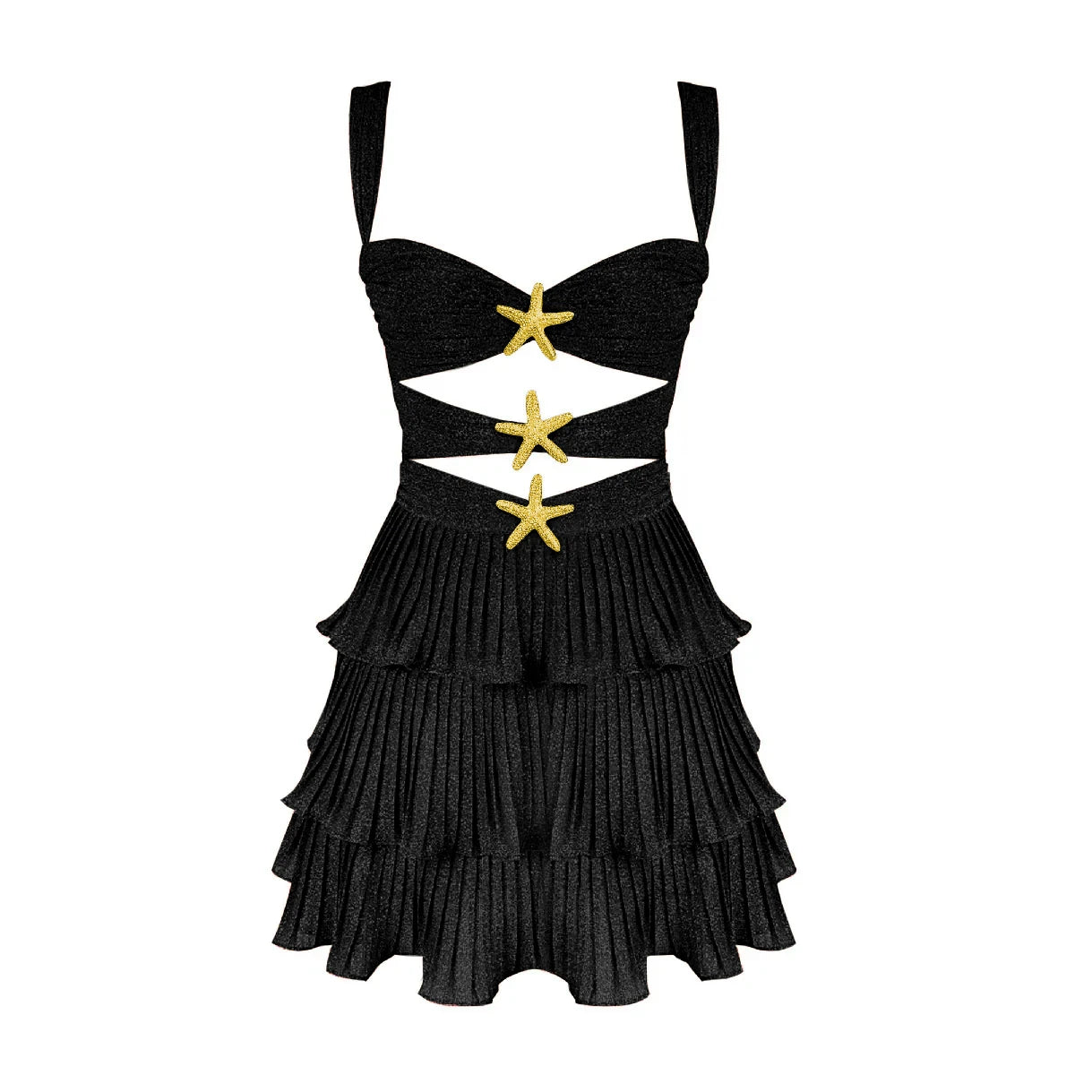 Das Kleid besticht durch breite, strukturierte Träger und einen herzförmigen Ausschnitt und ist vorne mit drei goldenen Seesternen verziert – ein exklusives Detail, das für Raffinesse und unwiderstehlichen tropischen Charme sorgt.
