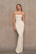 Step into glamour with the LUCINDA White Jumpsuit, the ultimate bridal statement piece expertly designed to turn heads on your special day. Crafted from our exclusive pearl-white shimmer sequin, this white belted jumpsuit hugs the body perfectly, paired with a flared trouser leg. The underwire bustier gives structure to complement your shape and a cinched silhouette. With removable diamanté straps and a detachable embellished belt, this versatile designer jumpsuit can be styled to your preference for a personalised bridal look.