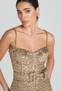 Lucinda Gold is the perfect piece for chic evenings and unforgettable moments. This gold jumpsuit is crafted from our exclusively designed sequins for a lustrous look. It has an underwire bustier and flared trousers to give structure and complement your shape; it’s boned to the front, back, and sides to create an ultra-flattering silhouette. The removable gold-look chain straps and detachable belt add a touch of versatility, allowing you to style it to fit this occasion.