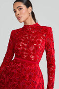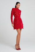 The LYDIA Red Dress is a statement mini dress crafted from sheer red velvet embroidered lace, that reveals a subtle hint of skin. This lace dress features a high neckline, shoulder pads, and our signature tulip mini skirt for a defined silhouette. Finished with elegant, scalloped detailing for an ultra-feminine finish. Complete with a concealed zip closure to the back for a smooth fit and a detachable satin fabric belt for adaptable elegance.