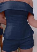 Design: Two-piece set featuring an off-shoulder structured top and tailored shorts