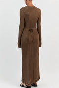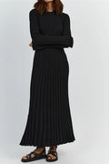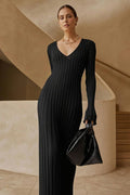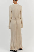 The Alessia Ribbed Flare Knit Maxi Dress redefines classic elegance with a modern edge. Designed with a round neckline and graceful flare sleeves, it balances structure with fluidity. The ribbed knit fabric hugs the figure, while the flared hemline adds playful movement for a flattering finish.