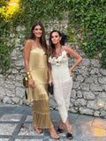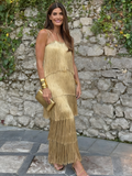 This captivating tiered fringe maxi dress dazzles with its golden hue and fluid movement. Designed with cascading layers of fringe and a sleek silhouette, it brings drama and elegance to any occasion.