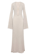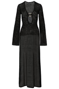 The Noelle Crochet V-Neck Maxi Dress is a statement of modern elegance. Designed in intricate crochet knit with subtle see-through details, it creates a look that is both daring and refined. The deep V-neckline is accented with metallic ring trims, while the strategic cut-outs and flowing bell sleeves add dramatic sophistication.
