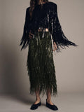 The Elara Fringe – Midi Skirt is a statement piece designed to captivate through movement, texture, and modern glamour.