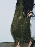 Its slim silhouette contrasts elegantly with the dynamic motion of the fringes, creating a refined yet impactful presence. Whether styled with a sleek top or a bold evening piece, the Elara Skirt instantly transforms any outfit into a stunning ensemble.
