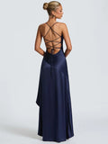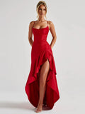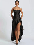 Step into timeless glamour with the Eternal Elegance Satin Gown, a dress designed to captivate from every angle. Featuring a sleek cowl neckline, adjustable spaghetti straps, and a daring high slit, it sculpts the body with sophistication while the cascading asymmetrical hemline adds dramatic movement.