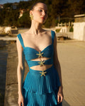 Designed with wide structured straps and a sweetheart neckline, the dress is adorned with three golden starfish accents at the front — an exclusive detail that adds sophistication and irresistible tropical allure.
