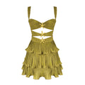The layered pleated skirt flows beautifully with every step, while the subtly shimmering fabric catches the light for a dazzling effect. Perfect for seaside parties, resort evenings, or any special summer occasion.