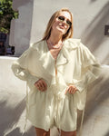 The blouse showcases cascading pleated details and delicate ties that add movement and grace, while the elastic waistband of the shorts ensures a flattering and comfortable fit. Perfect for spring and summer days, this set transitions seamlessly from relaxed mornings to evening outings.