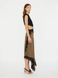 Step into modern elegance with the Twist & Lace Midi Dress, a bold fusion of structure and fluidity. Featuring a twisted tee detail seamlessly connected to a flowing satin skirt, this piece is elevated by lace-trimmed cut-outs and an asymmetric cascading hemline.
